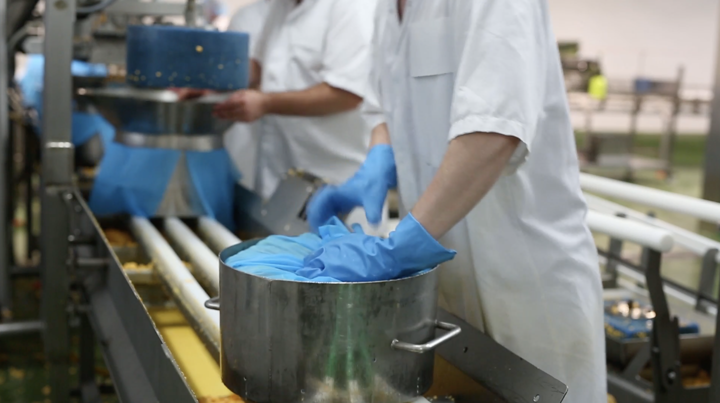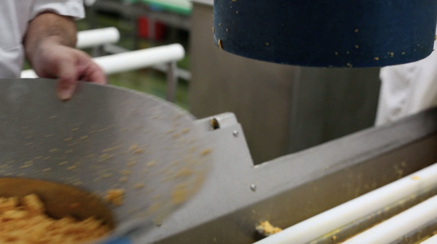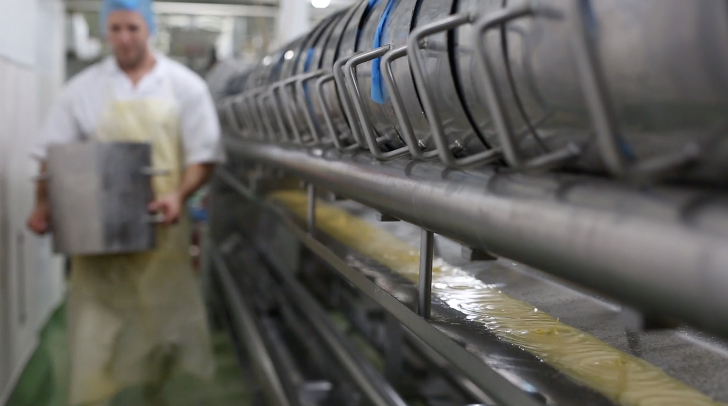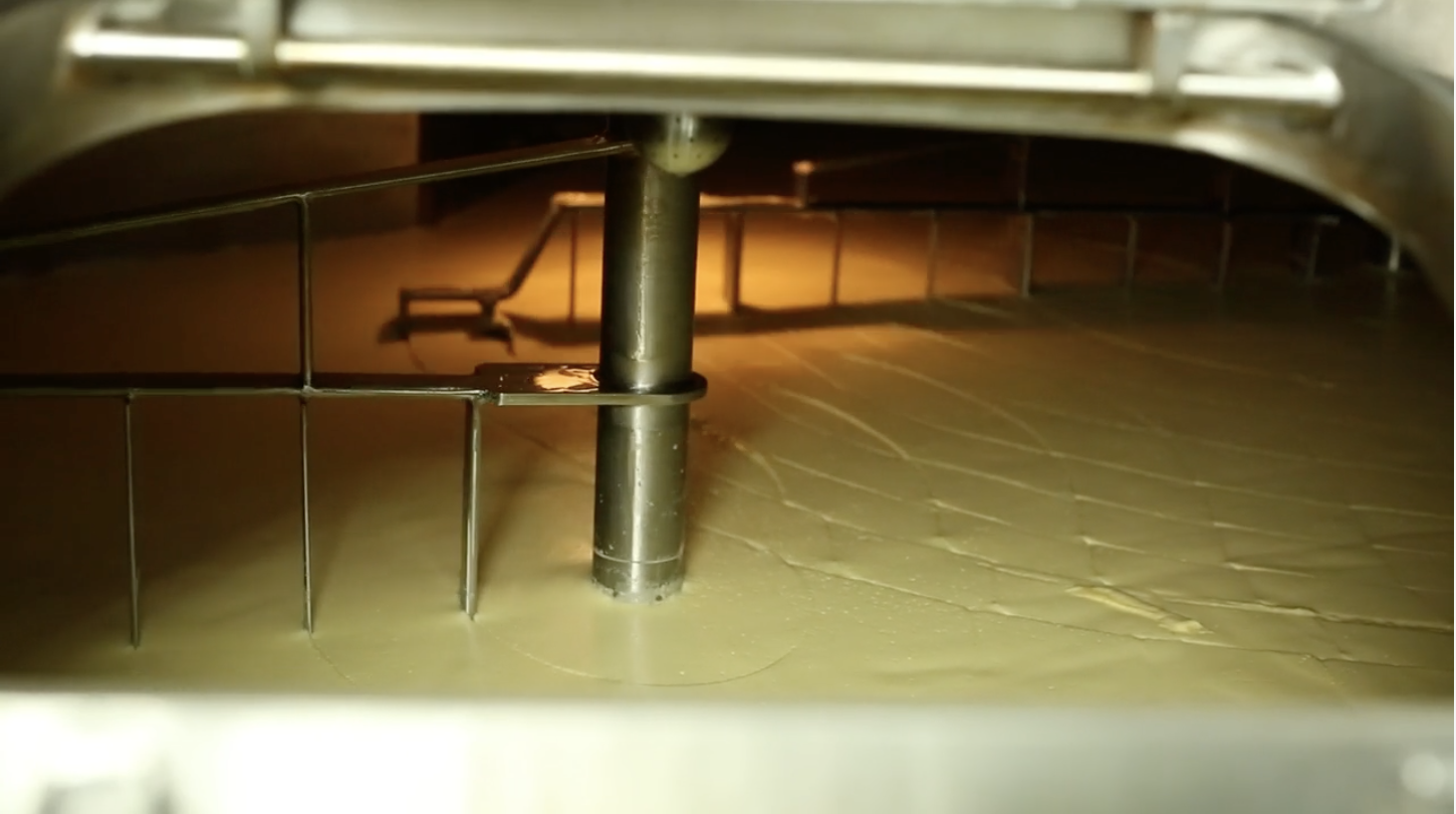 Once the curd has ripened, vegetarian rennet is added to help coagulate and set the milk. The Cheesemaker then checks the curd has a firm set before starting to cut the curd. The curds and whey are then gently heated to various temperatures depending on the cheese variety, before being stirred, prior to pitching onto the curd table.
