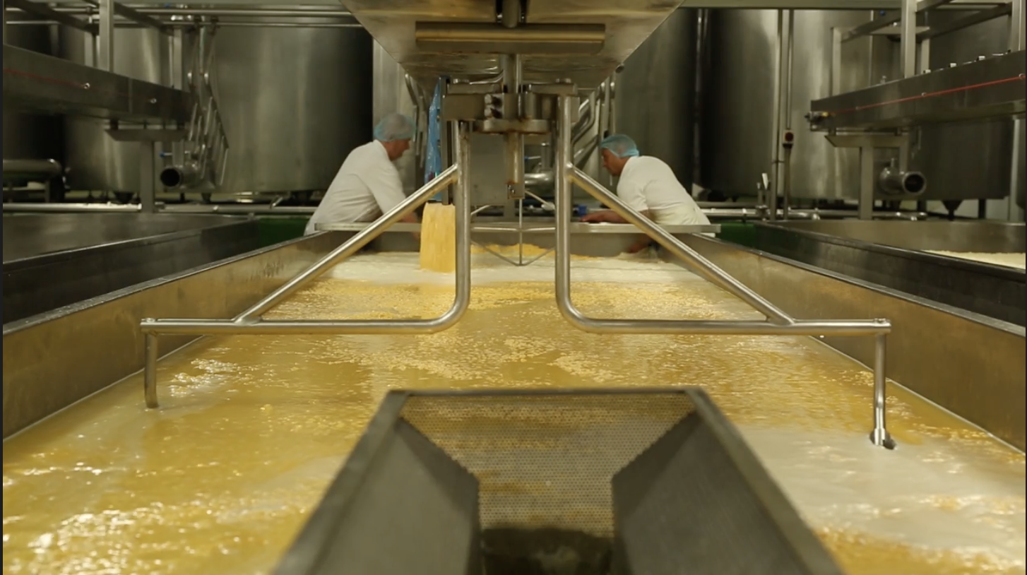 The milk is pasteurised to kill any harmful micro-organisms and then cooled before being pumped into the cheese vats. The dairy’s five vats hold 14,500 litres each and it is here the starter culture is added to the milk to help start the ripening of the milk and the formation of the curds and whey.