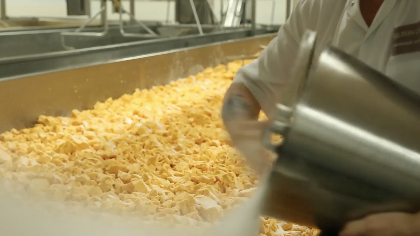 When the correct acidity is reached, the curd is then salted by hand to stop any further acidification.