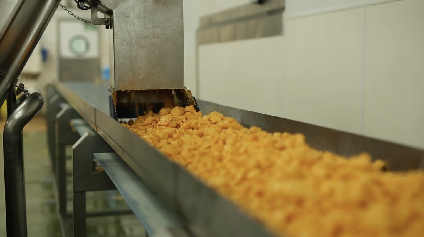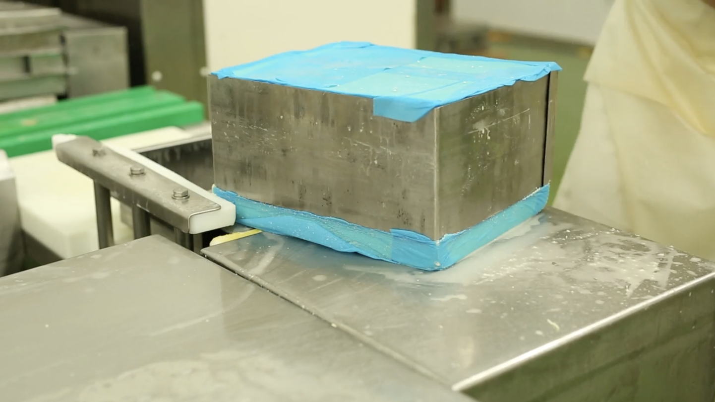 The milled curd is then weighed and packed into either 20kg block, 12kg traditional, 6kg top hat or 4kg wheel moulds.