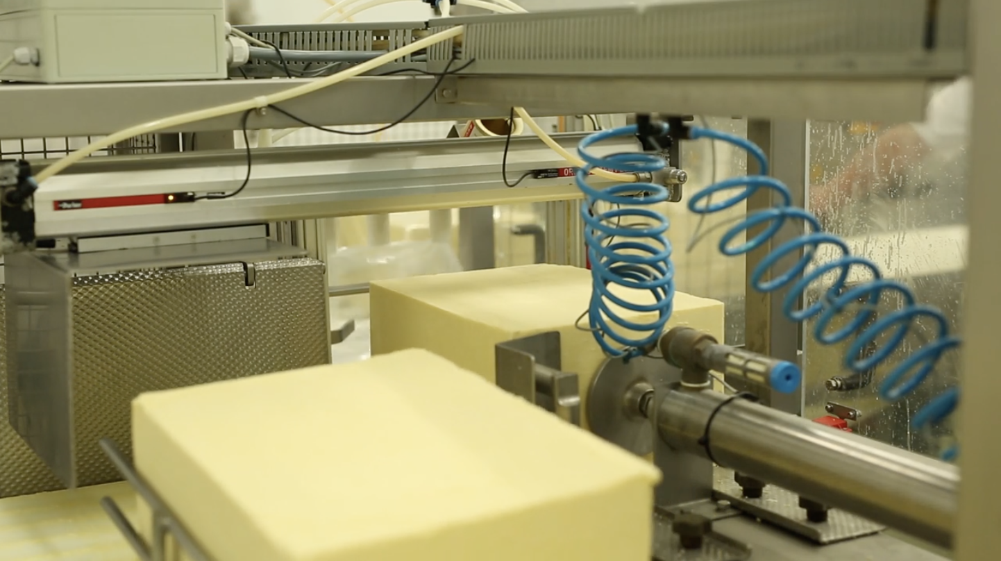 The cheese is placed in the shrink and drying tunnels. The packed cheese then goes through a metal detector before being weighed and labelled with information on variety, date of manufacture, vat number, best before date, enabling complete traceability back to the supplying farm if required.