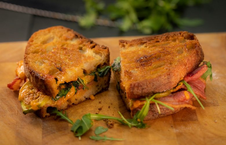 Using the same pan from the bacon, cook the toasties for 2-3 minutes on each side until golden and crisp and the Red Fox has melted.