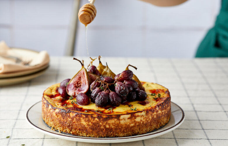 To serve, run a sharp knife around the inside of the cake tin, before removing the cheesecake from the tin. Transfer to a serving plate, carefully removing the baking parchment. Top with figs and grapes and any cooking juices, honey and a little extra thyme.