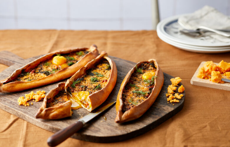 When all four pide are assembled, brush the dough with beaten egg. Bake for 10 minutes, remove from the oven and add an egg yolk to each pide. Return to the oven for 3-4 minutes. Finish the cooked pides with a little more dill.