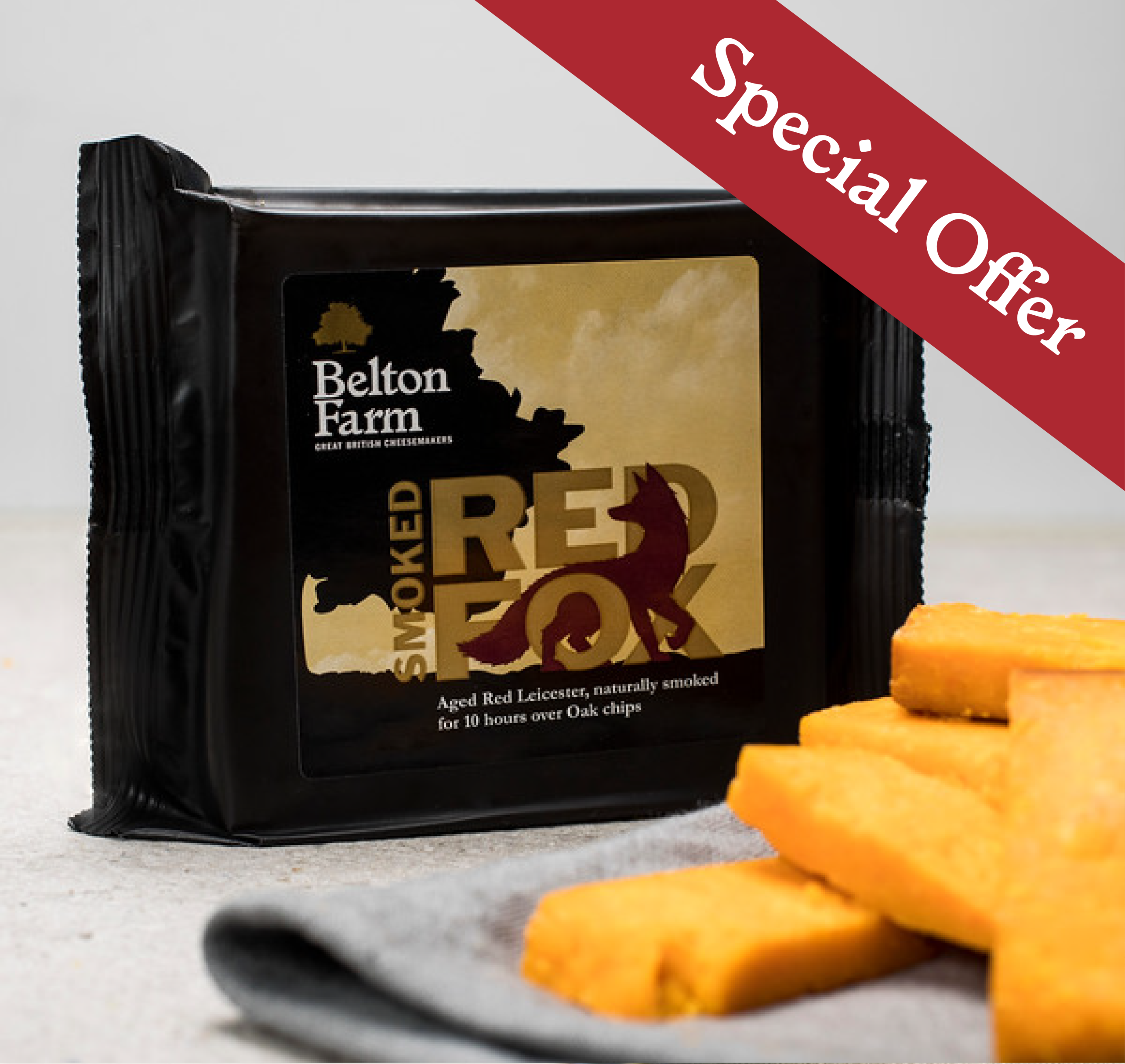 The complex blend of sweet and savoury distinctive flavours of the Red Fox, matured for between 16-18 months and naturally smoked over Oak chips. The russet coloured cheese has a cunningly unexpected crunch, from the naturally occurring calcium lactate crystals which form as the cheese matures.