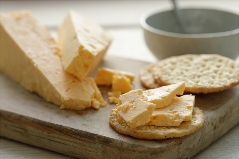 Our Cheshire cheese is light and crumbly with subtle hints of fresh citrus. The slightly salty taste is distinctive to the area our milk comes from as cows feed on the rich pastures of the Cheshire Plain, with its underlying rock salt deposits. The Cheshire Plain extends from the Mersey Valley in the north to the Shropshire Hills in the south. The addition of a touch of annatto, a natural plant extract, during the cheese making process gives a light amber colour to the cheese.